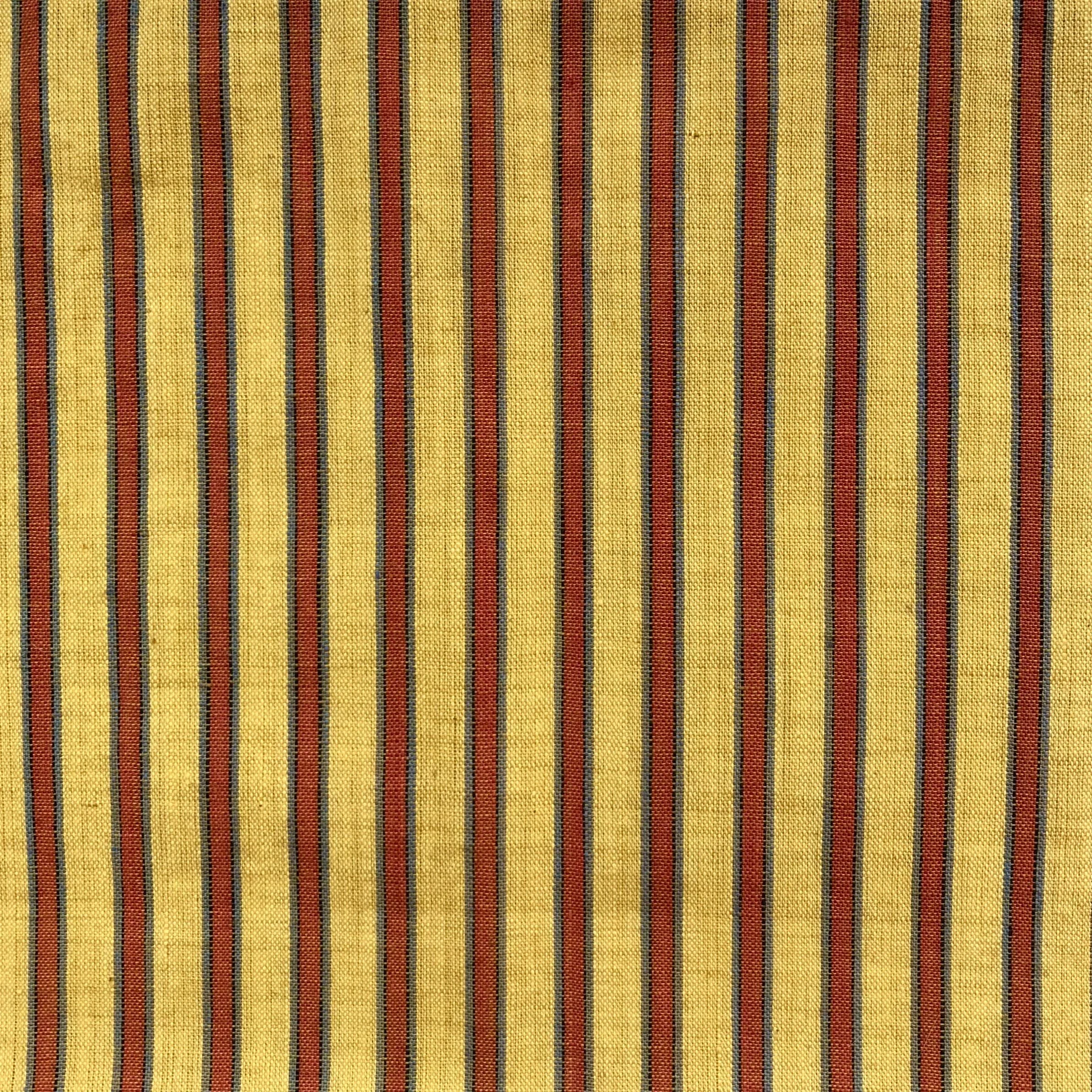 The July covering is made out of leftover fabric, using a vintage striped Japanese fabric from the 1930s-1950s. The fabric is a lemon yellow, with burnt orange and light blue stripes.